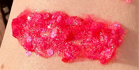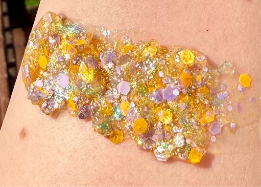 Cosmetic-grade glitter in different shapes and sizes. Polymer clay pieces are occasionally included also.
