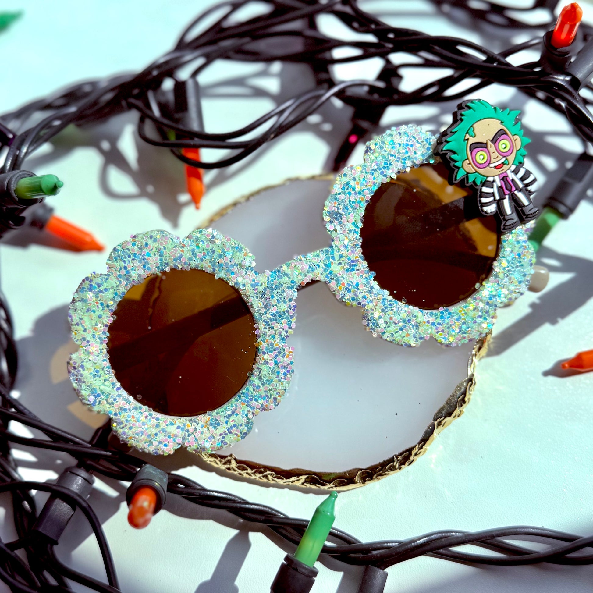 Get ready for "It's GLOWtime" with these playful and unique Sunnies! Featuring a charming nod to Beetlejuice, they'll make you stand out in a crowd. With glow in the dark glitter, they're perfect for Halloween or adding some sparkle to any outfit. Shine bright and have some fun!