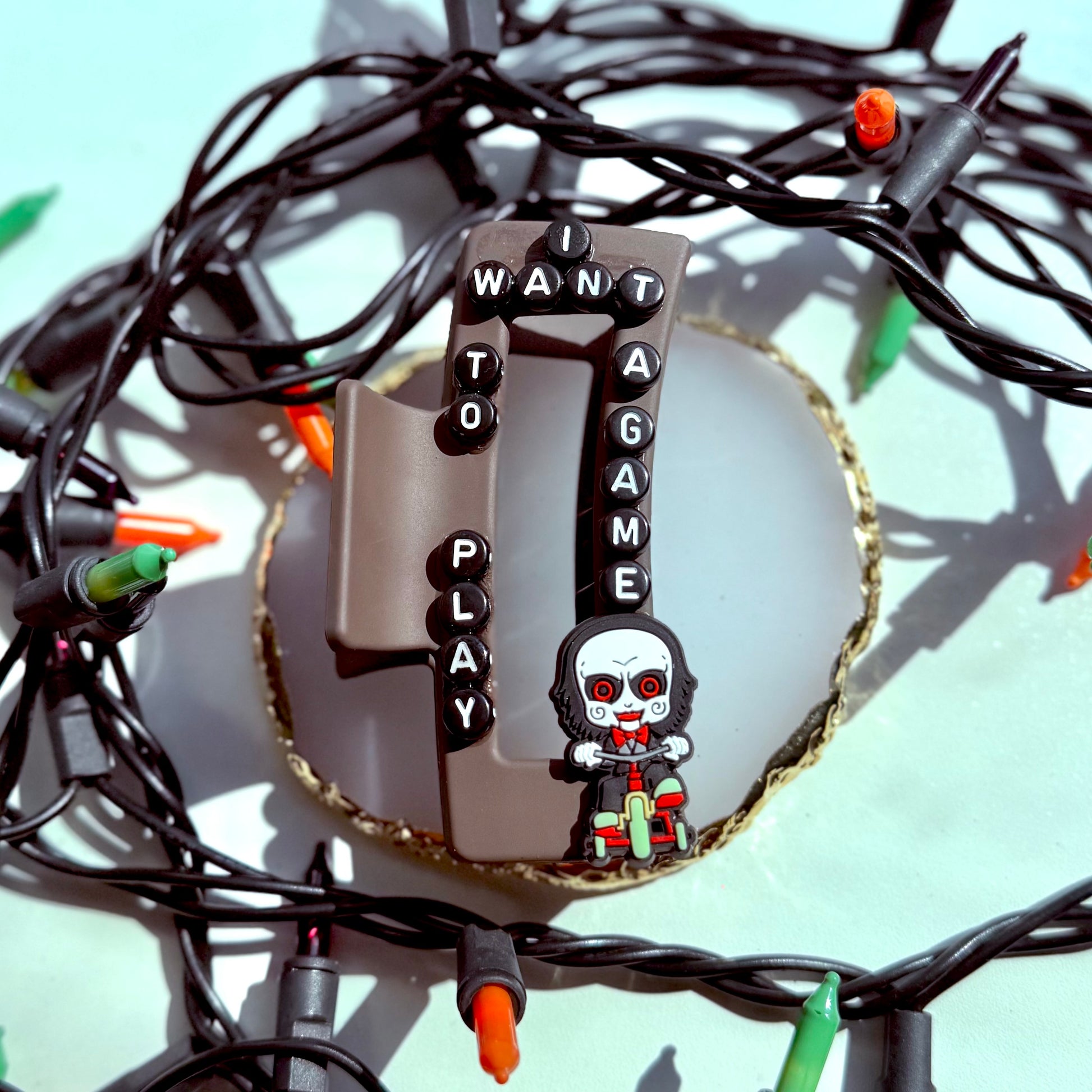 Unleash your inner horror fan with our Play a Game Claw Clip featuring Billy the Puppet from the iconic SAW movies. Perfect for Halloween or any horror-themed event, this clip will add a spooky touch to any outfit. Don't miss out on the chance to terrorize your friends and family with our creepy accessory.